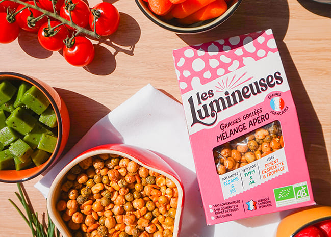Délicieux mélange de pois chiches grillés, délicatement enrobés de sésame et sel, de petits pois au thym et à l’ail et de fèves au piment d’Espelette et fromage… de quoi ravir vos papilles et réveiller vos apéritifs.